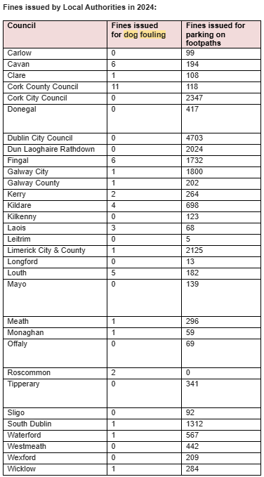 Carlow County Council issued 99 fines for motorists parking on footpaths in 2024, however, the local authority did not issue a single fine for dog fouling during the same period.
