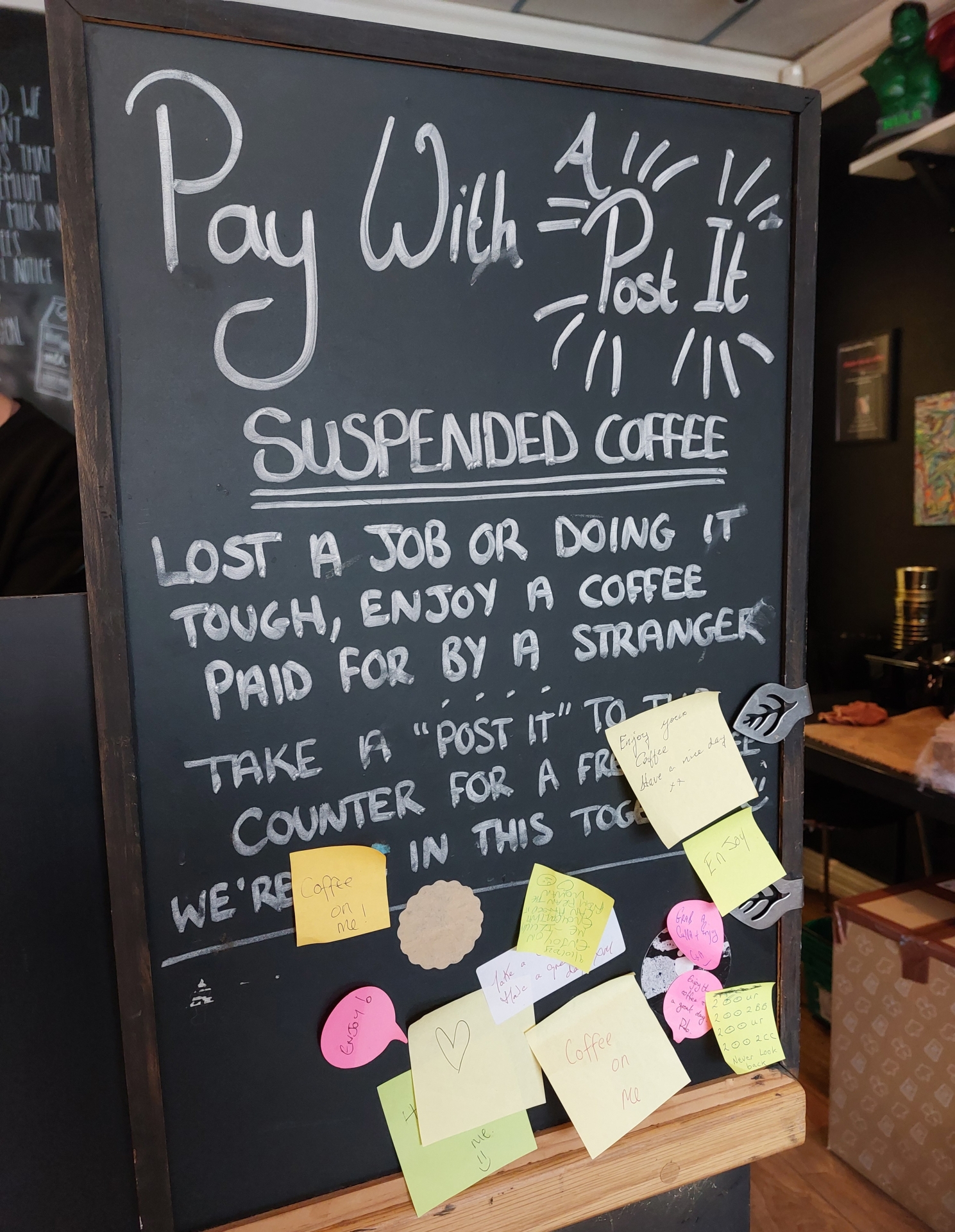 Brian also operates a pay it forward system within Neighbourhood where someone can pay for an extra coffee, a post-it note is put on the board and anybody that might come in to the café who is either low on money, or having a bad day, can grab a post-it and get a free tea or coffee.