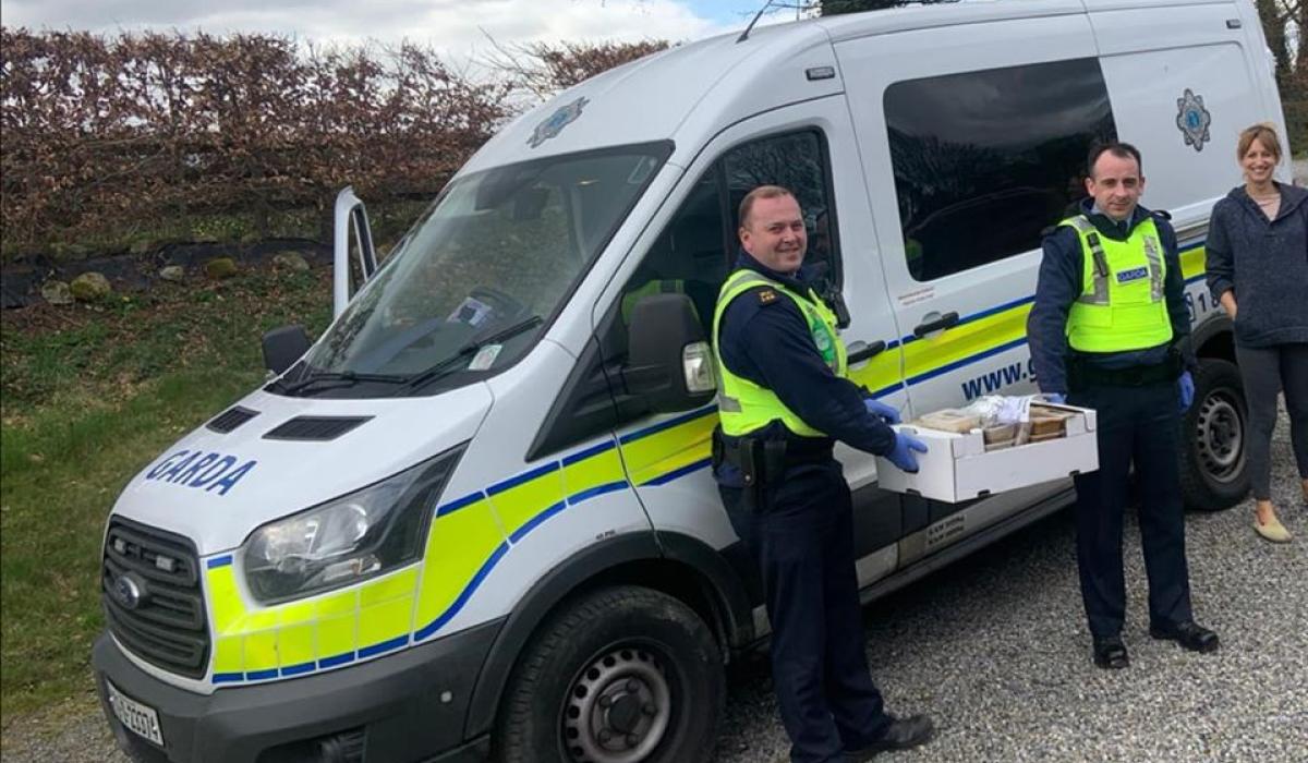 Pictured above are Carlow Gardaí collecting food from Thrive Café in Tullow to drop to St Luke's to "fuel the frontlines" during the Covid-19 pandemic.